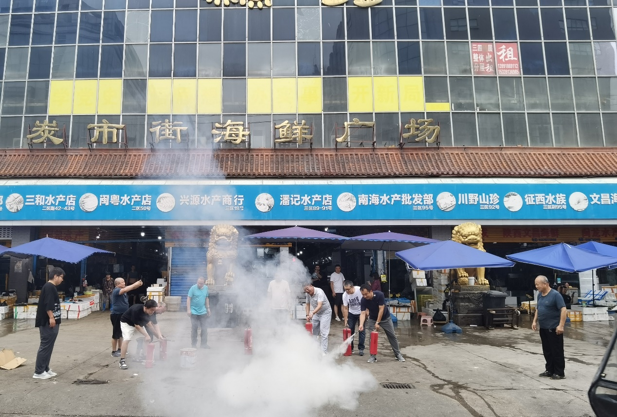 炭市街水產(chǎn)市場具有經(jīng)營單位種類復(fù)雜、人流密集、消防隱患風(fēng)險較高的特點。在演練現(xiàn)場,安全管理人員向各商戶代表詳細(xì)介紹了滅火器材的使用方法及操作要領(lǐng)。參練人員在安全員的指導(dǎo)下,分批有序使用滅火器材進行了現(xiàn)場滅火演習(xí)。